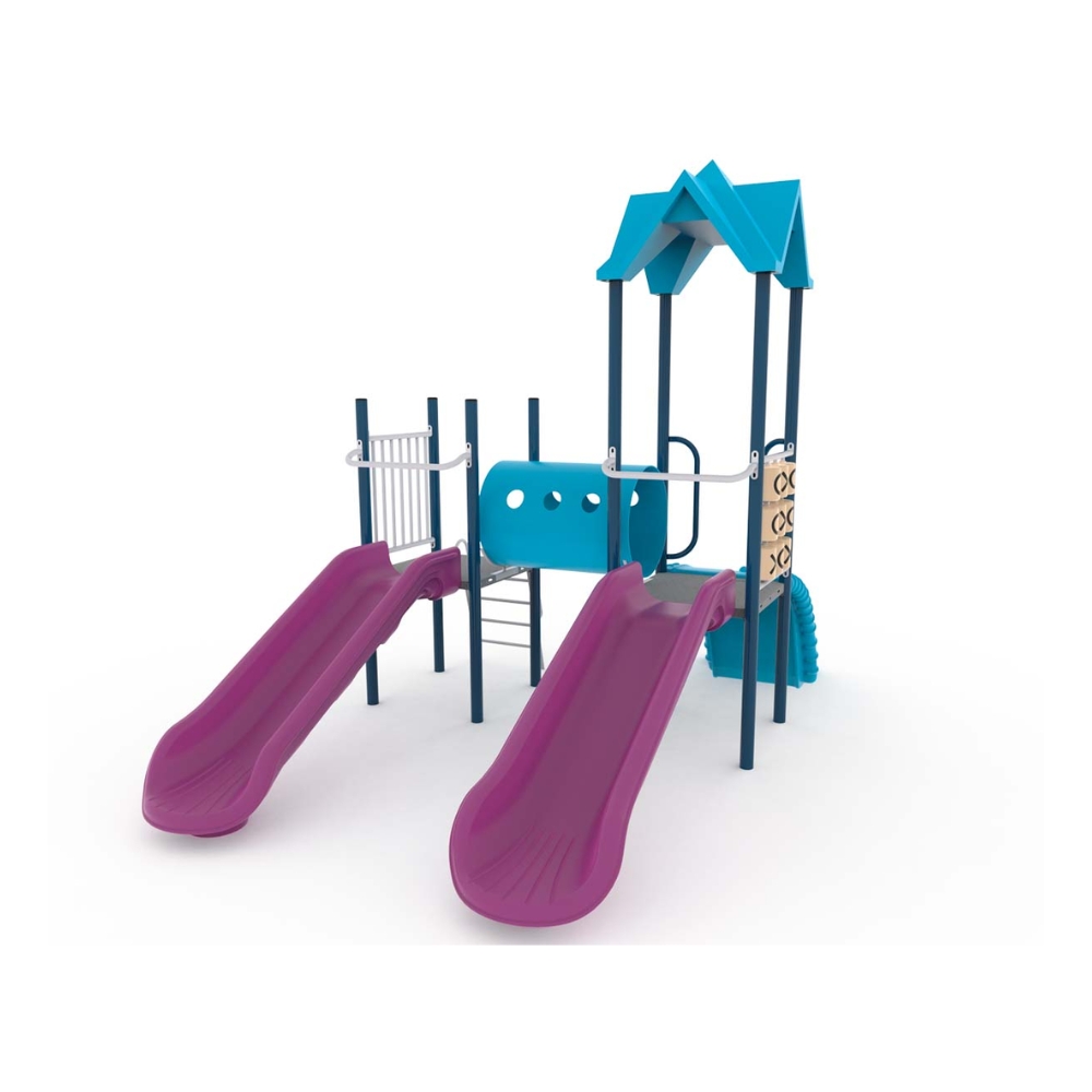 Mangrullo dos torres espacial. Se accede por palestra o por escalera. Ambas torres están conectadas por un puente túnel de gateo. Incluye panel TaTeTi plástico, 2 toboganes simples abiertos y 1 techo plástico a cuatros aguas.