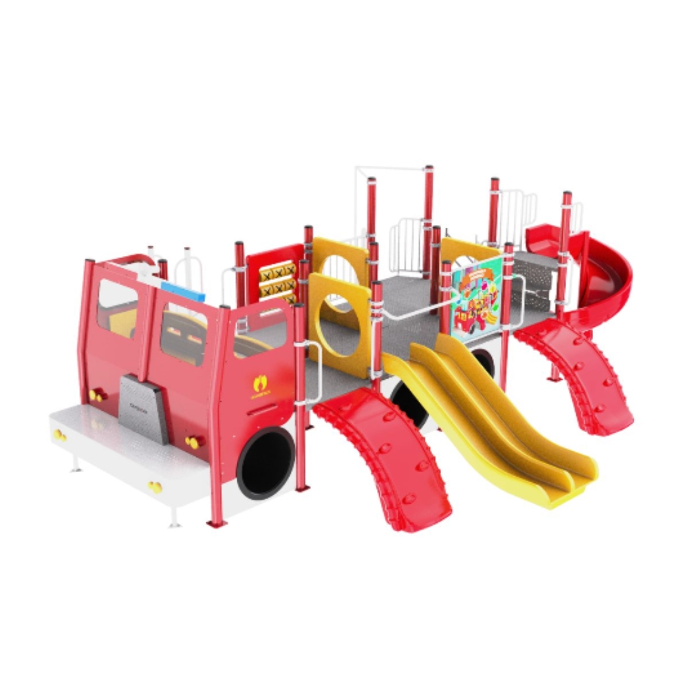 Mangrullo multijuego con forma de autobomba para plazas o parque públicos. Se puede acceder mediante la escalera de ingreso o las palestras o los steps, una vez dentro los niños pueden jugar con el panel TaTeTi, pasar por los marcos de rotomoldeo o sentarse en los bancos y jugar con los volantes; pueden descender por la pista doble, el tobogán rulo o el tubo de bomberos. También pueden atravesar por debajo del camión pasando por las ruedas.