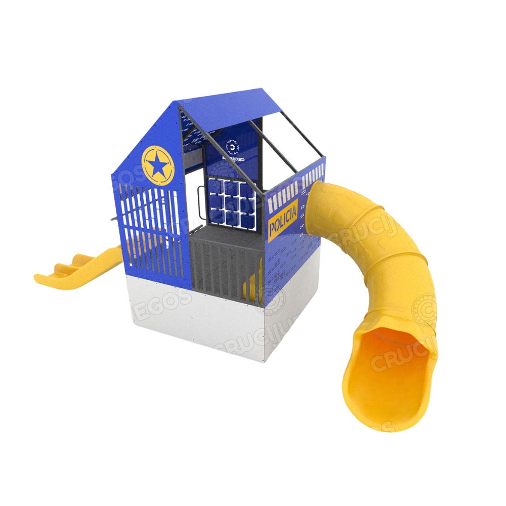 Juego temático para espacios publicos con forma de estación de policia. Forma parte de la familia de productos MINI CIUDAD. Posee un tobogan doble y un tobogan tubo curvo.