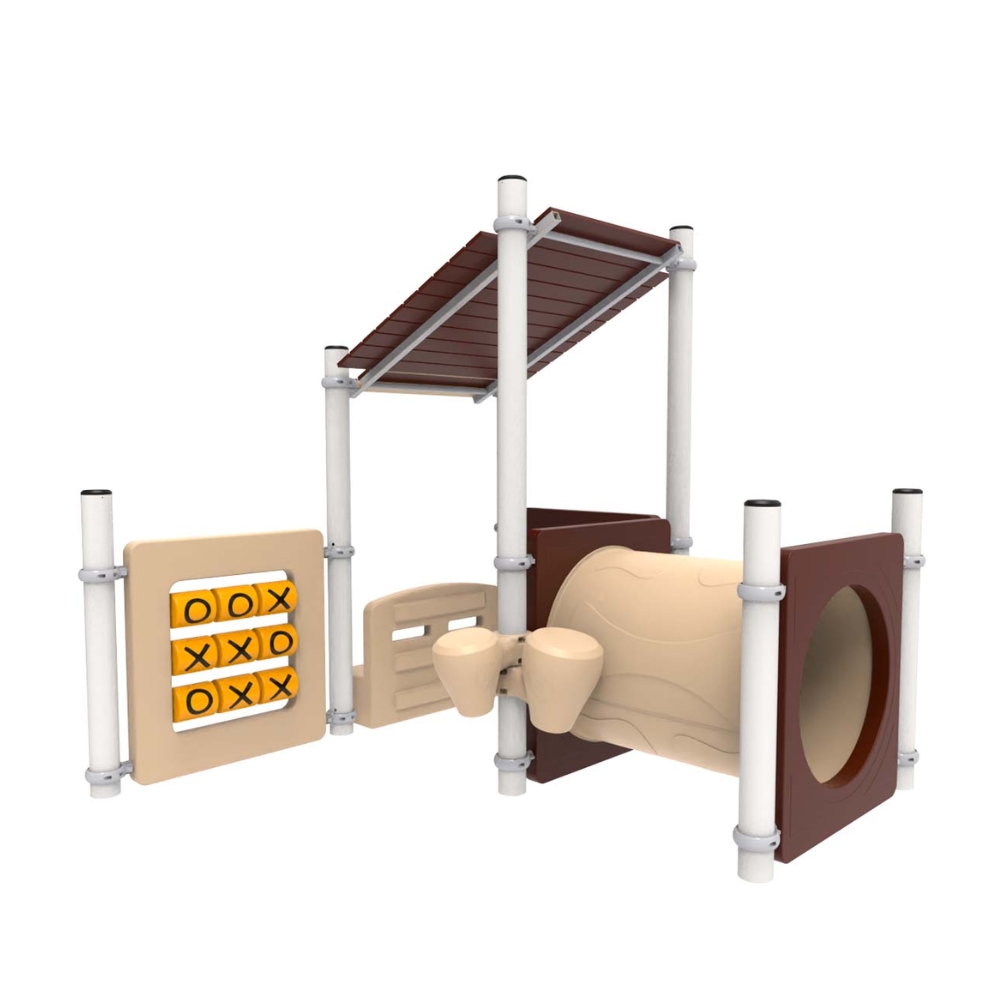 Mangrullo diseñado para la primera infancia. Cuenta con un tubo de gateo, un TaTeTi, un banco, una burbuja y unos tambores. La temática está inspirada en las cabañas del bosque y su atributo principal es la utilización de plástico 100% reciclado, transformado en tablas y listones simil madera de diferentes tonalidades, que se utilizan como material fundamental para la construcción del techo. De esta manera contribuimos con el cuidado del medio ambiente reutilizando tapitas, envases y desechos plásticos.