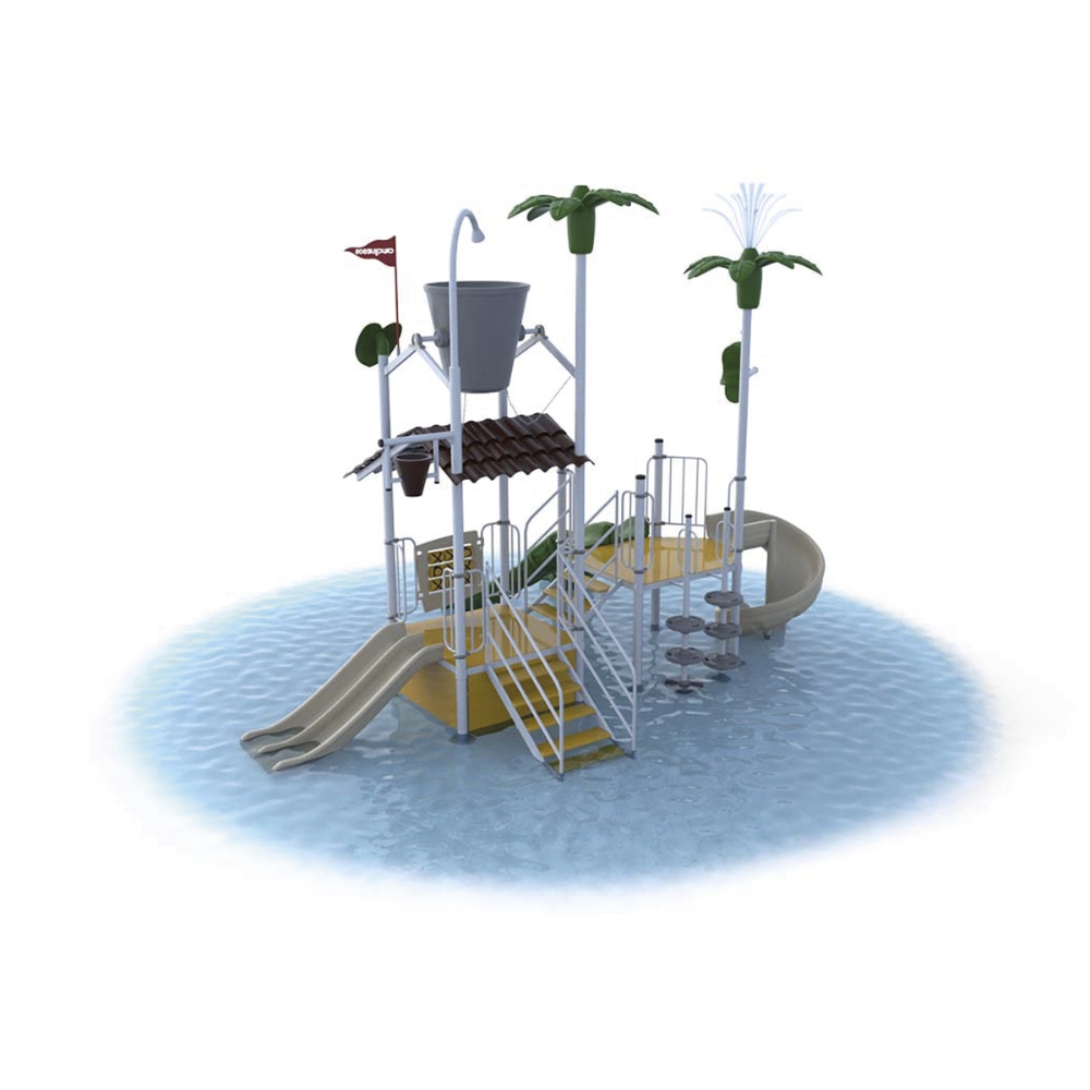 Mangrullo Acuático Temático, ideal para piletas de hoteles, campings y parques acuáticos que deseen un sector de entretenimiento para toda la familia. Posee dos pisos, cinco toboganes, dos baldes de agua y una palmera aspersora.